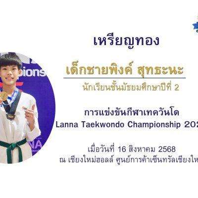 เด็กชายพิงค์ สุทธะนะ ชั้นมัธยมศึกษาปีที่ 2/7 ได้รับชนะเลิศเหรียญทอง การแข่งขันชิงแชมป์ภาคเหนือ 2568 Lanna Taekwondo Championship 2025 ประเภทต่อสู้ Kyorugi รุ่นอายุ 13-14 ปี ชาย น้ำหนัก 39 – 43 กก. เมื่อวันที่ 16 สิงหาคม 2568 ณ เชียงใหม่ฮอลล์ ศูนย์การค้าเซ็นทรัล เชียงใหม่ แอร์พอร์ต จัดโดย การกีฬาแห่งประเทศไทย จังหวัดเชียงใหม่ ร่วมกับสมาคมกีฬาแห่งจังหวัดเชียงใหม่
