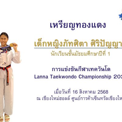 เด็กหญิงภัทศิตา ศิริปัญญา ชั้นมัธยมศึกษาปีที่ 1/7 ได้รับรางวัลรองชนะเลิศอันดับที่ 2 เหรียญทองแดง การแข่งขันชิงแชมป์ภาคเหนือ 2568 Lanna Taekwondo Championship 2025 รุ่นอายุ 13-14 ปี หญิง เมื่อวันที่ 16 สิงหาคม 2568 ณ เชียงใหม่ฮอลล์ ศูนย์การค้าเซ็นทรัล เชียงใหม่ แอร์พอร์ต จัดโดย การกีฬาแห่งประเทศไทย จังหวัดเชียงใหม่ ร่วมกับสมาคมกีฬาแห่งจังหวัดเชียงใหม่
