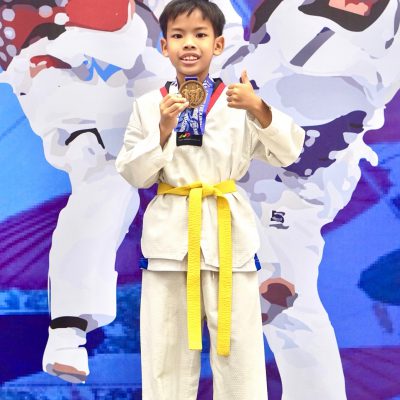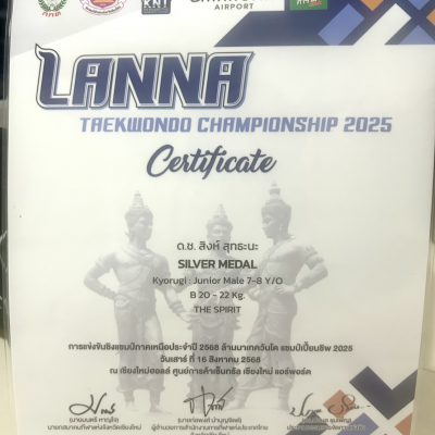 ได้รับรางวัล เหรียญเงิน ประเภทต่อสู้ (Kyorugi) รุ่นอายุ 7-8 ปี(ชาย) น้ำหนัก 20-22 กิโลกรัม