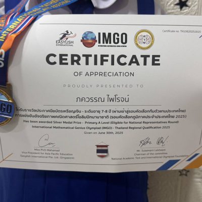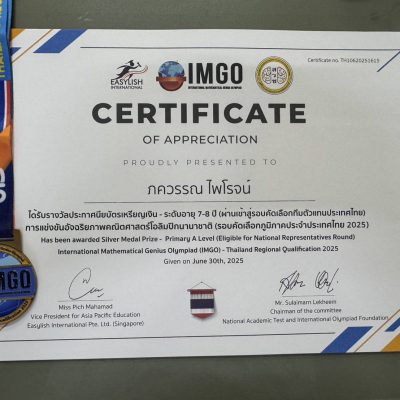 ขอชื่นชมและแสดงความยินดีกับ เด็กหญิง ภควรรณ ไพโรจน์ ชั้ประถมศึกษาปีที่ 2/4  ได้รับรางวัลเหรียญเงิน  จากการแข่งขันอัจฉริยภาพคณิตศาสตร์โอลิมปิกนานาชาติ
