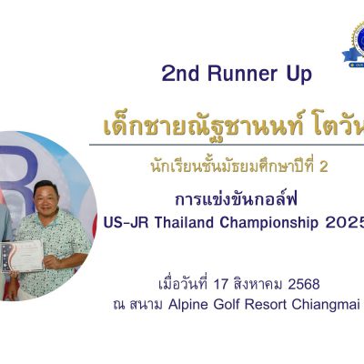 ขอชื่นชมและแสดงความยินดีกับ เด็กชายณัฐชานนท์ โตวัน ชั้นมัธยมศึกษาปีที่ 2/2 ได้รับ รางวัล 2nd Runner Up : Class A – BOY การแข่งขันกอล์ฟรายการ US-JR Thailand Championship 2025 เมื่อวันที่ 17 สิงหาคม 2568 ณ Alpine Golf Resort Chiangmai จัดโดย US – JR Thailand Championship