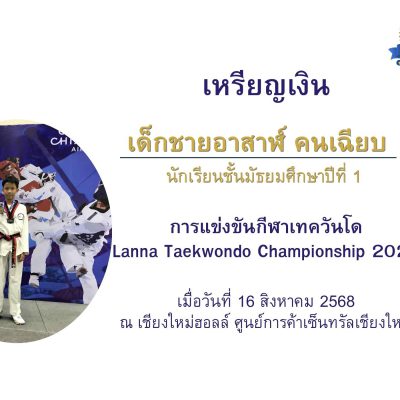 ขอชื่นชมและร่วมแสดงความยินดีกับ เด็กชายอาสาฬ์ คนเฉียบ ชั้นมัธยมศึกษาปีที่ 1/1 ได้รับรางวัลเหรียญเงิน ประเภท Kyorugi: Cadet Male 13-14 Y/O การแข่งขันชิงแชมป์ภาคเหนือ 2568 Lanna Taekwondo Championship 2025 เมื่อวันที่ 16 สิงหาคม 2568 ณ เชียงใหม่ฮอลล์ ศูนย์การค้าเซ็นทรัล เชียงใหม่ แอร์พอร์ต จัดโดย การกีฬาแห่งประเทศไทย จังหวัดเชียงใหม่ ร่วมกับสมาคมกีฬาแห่งจังหวัดเชียงใหม่