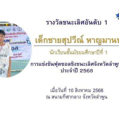 ขอชื่นชมและร่วมแสดงความยินดีกับ เด็กชายสุปวีณ์ หาญมานพ ชั้นมัธยมศึกษาปีที่ 1/2 ได้รับรางวัลชนะเลิศอันดับ 1 การแข่งขันฟุตซอลชิงชนะเลิศ จังหวัดลำพูน ประจำปี 2568 (รุ่นอายุไม่เกิน 12 ปี) เมื่อวันที่ 10 สิงหาคม 2568 ณ สนามกีฬากลาง จังหวัดลำพูน จัดการแข่งขันโดย สมาคมกีฬาแห่งจังหวัดลำพูนและสำนักงานการกีฬาแห่งประเทศไทยจังหวัดลำพูน