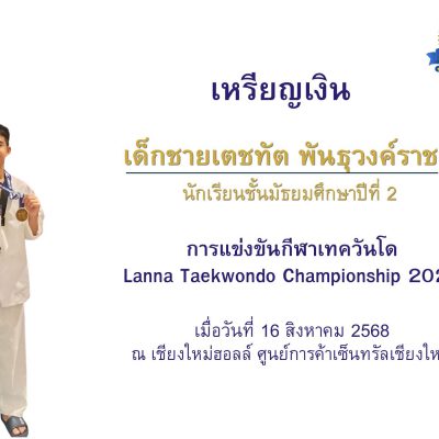 ขอชื่นชมและร่วมแสดงความยินดีกับ เด็กชายเตชทัต พันธุวงค์ราช ชั้นมัธยมศึกษาปีที่ 2/8 ได้รับรางวัลเหรียญเงิน ประเภทต่อสู้ Class B รุ่นอายุ 13 – 14 ปี ชาย น้ำหนัก 55-59 กิโลกรัมการแข่งขันชิงแชมป์ภาคเหนือ 2568 Lanna Taekwondo Championship 2025 เมื่อวันที่ 16 สิงหาคม 2568 ณ เชียงใหม่ฮอลล์ ศูนย์การค้าเซ็นทรัล เชียงใหม่ แอร์พอร์ต จัดโดย การกีฬาแห่งประเทศไทย จังหวัดเชียงใหม่ ร่วมกับสมาคมกีฬาแห่งจังหวัดเชียงใหม่