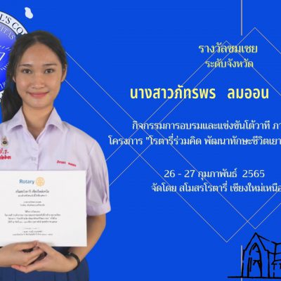 ขอแสดงความยินดีกับ นางสาวภัทรพร  ลมออน  ม.5/4   ที่ได้รับรางวัลชมเชย จากการเข้าร่วมกิจกรรมการอบรมและการแข่งขันโต้วาที ภาคภษาไทย โครงการ “โรตารีร่วมคิด พัฒนาทักษะชีวิตเยาวชน” ครั้งที่ 2  วันที่ 26 – 27 กุมภาพันธ์ 2565 จัดโดยสโมสรโรตารี เชียงใหม่เหนือ