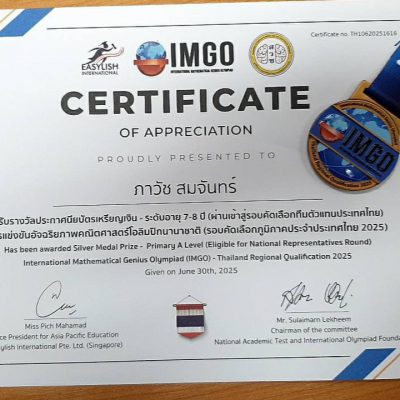 ขอชื่นชมและร่วมแสดงความยินดีกับ เด็กชายภาวัช สมจันทร ชั้นประถมศึกษาปีที่ 2/14 ได้รับเหรียญเงิน ระดับ Primary A (อายุ 7-8 ปี) การแข่งขันอัจฉริยภาพคณิตศาสตร์โอลิมปิกนานาชาติ (รอบคัดเลือกทีมตัวแทนประเทศไทย 2025)IMGO-Thailand National Representatives 2025 จัดโดย มูลนิธิโครงการสอบวัดทักษะวิชาการและโอลิมปิกนานาชาติ ณ โรงเรียนเรยีนาเชลีวิทยาลัย อำเภอเมือง จังหวัดเชียงใหม่ เมื่อวันที่ 7 มิถุนายน 2568