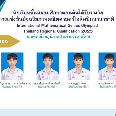 ขอชื่นชมและร่วมแสดงความยินดีกับ นักเรียนชั้นมัธยมศึกษาตอนต้น ได้รับรางวัลจากการแข่งขันอัจฉริยภาพคณิตศาสตร์โอลิมปิกนานาชาติ International Mathematical Genius Olympiad (IMGO)-Thailand Regional Qualification 2025 จัดโดยมูลนิธิโครงการสอบวัดทักษะวิชาการและโอลิมปิกนานาชาติ (มูลนิธิ สวช. และโอลิมปิกนานาชาติ) ณ สนามสอบโรงเรียนเรยีนาเชลีวิทยาลัย จังหวัดเชียงใหม่ เมื่อวันที่ 7 มิถุนายน 2568