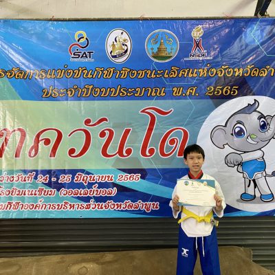 ขอแสดงความยินดีกับ เด็กชายจิตติพัฒน์ ไพรศรี นักเรียนชั้นประถมศึกษาปีที่ 5/12 ที่ได้รับรางวัลชนะเลิศการแข่งขันกีฬาเทควันโดประเภทพุมเซ่ สายเขียว รุ่นอายุ 9 – 10 ปี และ รางวัลชนะเลิศประเภทพุมเซ่ทีม สายเหลือง การแข่งขันกีฬาชิงชนะเลิศแห่งจังหวัดลำพูน ประจำปีงบประมาณ 2565 วันที่ 24 – 25 มิถุนายน 2565 ณ สนามกีฬาองค์การบริหารส่วนจังหวัดลำพูน