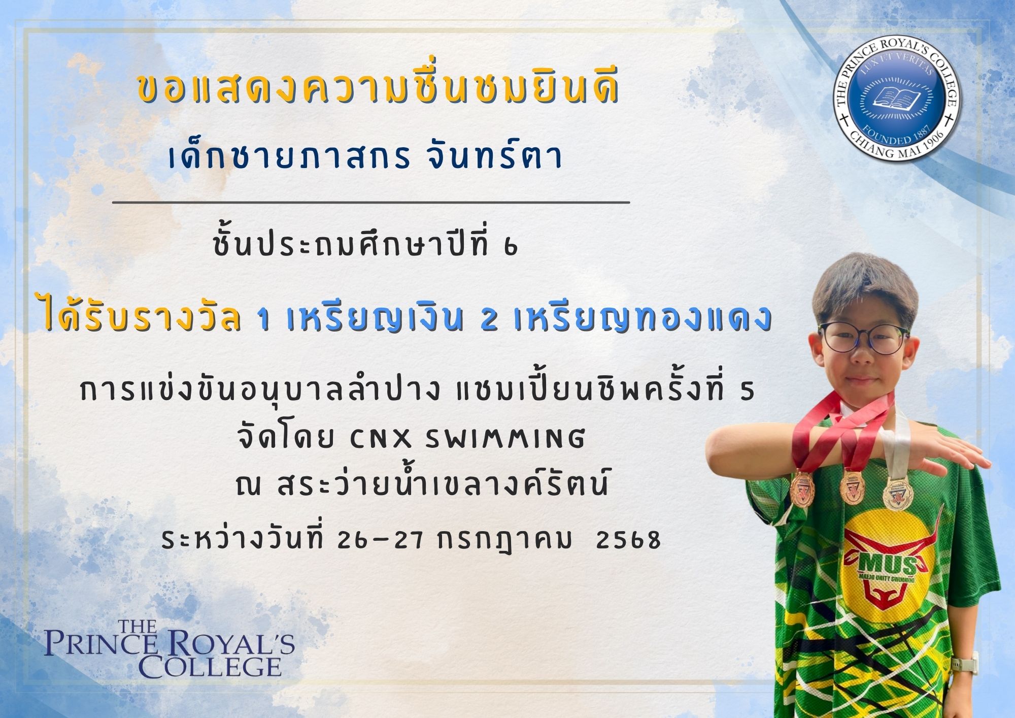 🥉2 เหรียญทองแดง จากท่าผีเสื้อ 50 เมตร, ท่าฟรีสไตล์ 50 เมตร 12 ปี ชายการแข่งขันอนุบาลลำปาง แชมเปี้ยนชิพครั้งที่ 5