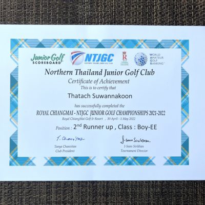 ขอแสดงความยินดีกับเด็กชายธธัช สุวรรณกูล ชั้น ป. 1/1 รางวัลรองชนะเลิศ อันดับ2 รายการ กอล์ฟ Northern Thailand Junior Golf Championships 2021-2022 ณ สนามกอล์ฟ Royal Chiangmai Golf & Resort จ.เชียงใหม่ เมื่อวันที่ 30 เมษายน – 1 พฤษภาคม 2565 จัดโดย NTJGC (Northern Thailand Junior Golf Club) ระดับภาคเหนือ