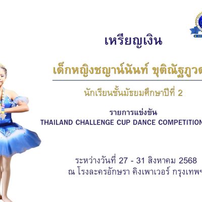 ขอชื่นชมและร่วมแสดงความยินดีกับ เด็กหญิงชญาน์นันท์ ขุติณัฐภูวดล ชั้นมัธยมศึกษาปีที่ 2/8 ได้รับเหรียญเงิน 3rd Place Ensemble Ballet Teen 13-15 Year การแข่งขัน THAILAND CHALLENGE CUP DANCE COMPETITION 2025 ระหว่างวันที่ 27 – 31 สิงหาคม 2568 ณ โรงละครอักษรา คิงเพาเวอร์ กรุงเทพฯ
