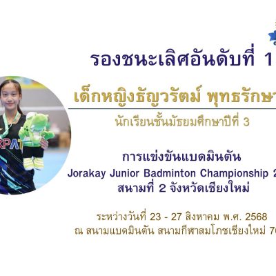ขอชื่นชมและแสดงความยินดีกับ เด็กหญิงธัญวรัตม์ พุทธรักษา ชั้นมัธยมศึกษาปีที่ 3/8 ได้รับรางวัลรองชนะเลิศอันดับที่ 1 ประเภทหญิงคู่ รุ่น U17 ในการแข่งขันแบดมินตันรายการ Jorakay Junior Badminton Championship 2025 สนาม 2 จ.เชียงใหม่ ระหว่างวันที่ 23 – 27 สิงหาคม 2568 ณ สนามแบดมินตัน สนามกีฬาสมโภชเชียงใหม่ 700 ปี จัดโดย สมาคมแบดมินตันแห่งประเทศไทย