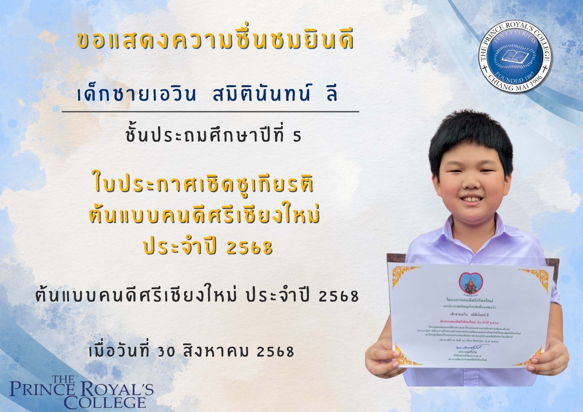 เด็กชายเอวิน สมิตินันทน์ ลี ได้รับใบประกาศเชิดชูเกียรติ ต้นแบบคนดีศรีเชียงใหม่ ประจำปี 2568