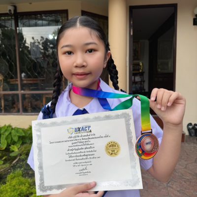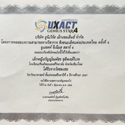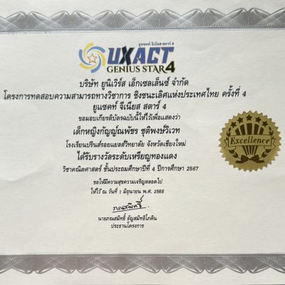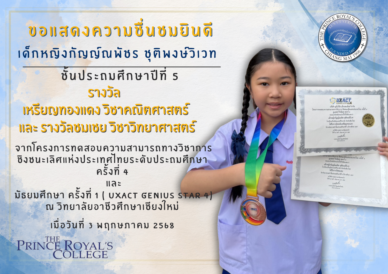 เด็กหญิงกัญญ์ณพัชร ชุติพงษ์วิเวท นักเรียนระดับชั้นประถมศึกษาปีที่ 5 รางวัลเหรียญทองแดง วิชาคณิตศาสตร์ และ รางวัลชมเชย  วิชาวิทยาศาสตร์ จากโครงการทดสอบความสามารถทางวิชาการชิงชนะเลิศแห่งประเทศไทยระดับประถมศึกษา ครั้งที่ 4 และมัธยมศึกษา ครั้งที่ 1 ( uxact genius star 4)