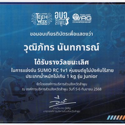 ในการแข่งขัน SUMO RC 1v1 หุ่นยนต์ซูโม่บังคับไร้สาย ประเภทนํ้าหนักไม่เกิน 1 kg รุ่น Junior และได้สิทธิ์เป็นตัวแทนประเทศไทยไปแข่งขันในระดับโลก WORLD ROBOT GAMES 2025 ที่ไต้หวัน