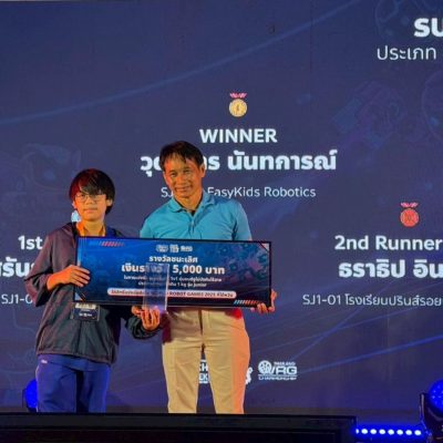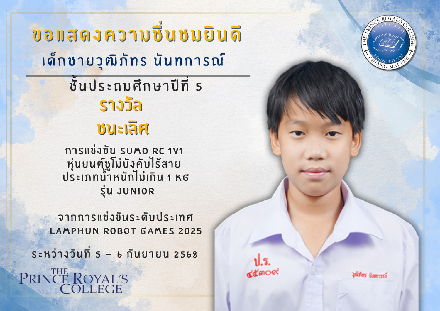 ในการแข่งขัน SUMO RC 1v1 หุ่นยนต์ซูโม่บังคับไร้สาย ประเภทนํ้าหนักไม่เกิน 1 kg รุ่น Junior และได้สิทธิ์เป็นตัวแทนประเทศไทยไปแข่งขันในระดับโลก WORLD ROBOT GAMES 2025 ที่ไต้หวัน