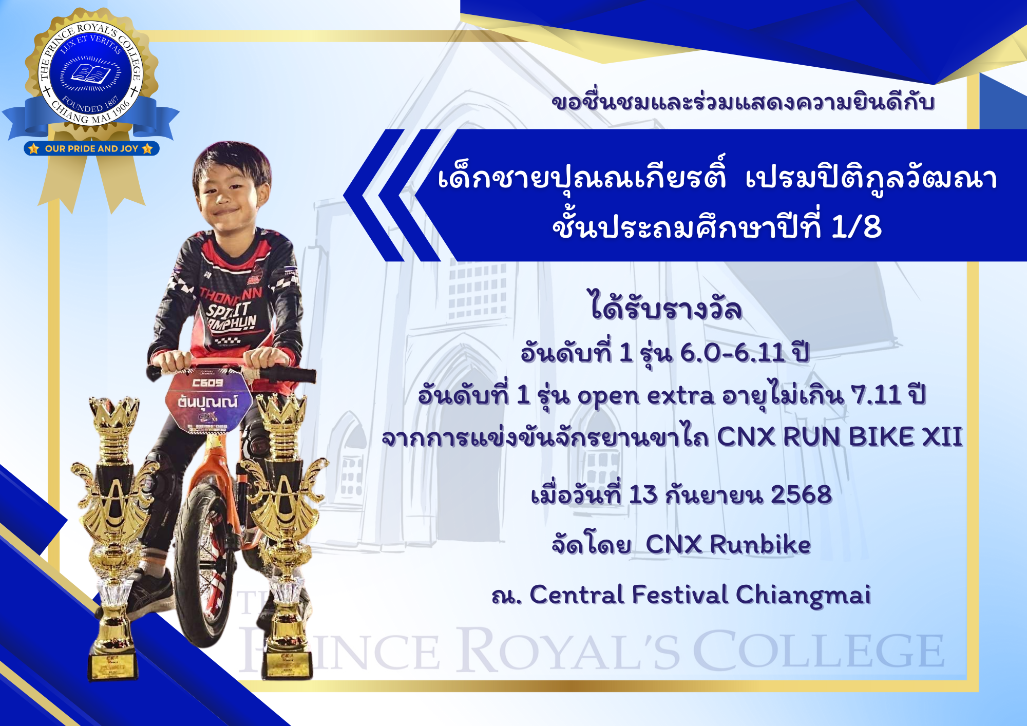 ขอชื่นชมและร่วมแสดงความยินดีกับ เด็กชายปุณณเกียรติ์ เปรมปิติกูลวัฒณา ชั้นประถมศึกษาปีที่ 1/8 ได้รับรางวัล อันดับที่ 1 รุ่น 6.0-6.11 ปี อันดับที่ 1 รุ่น open extra อายุไม่เกิน 7.11 ปี จากการแข่งขันจักรยานขาไถ CNX RUN BIKE XII เมื่อวันที่ 13 กันยายน 2568 จัดโดย CNX Runbike ณ. Central Festival Chiangmai