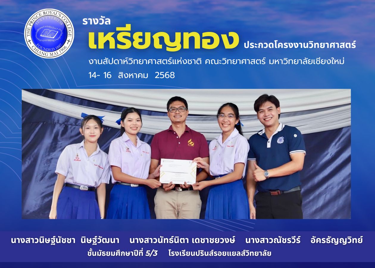 ขอชื่นชมและแสดงความยินดีทีมนักเรียน PRC ที่ได้รับรางวัลเหรียญทอง สาขากายภาพ จากการประกวดโครงงานวิทยาศาสตร์ ระดับมัธยมศึกษาตอนปลาย จากงานสัปดาห์วิทยาศาสตร์แห่งชาติ ส่วนภูมิภาค ประจําปี พ.ศ.2568 จัดโดย คณะวิทยาศาสตร์ มหาวิทยาลัยเชียงใหม่ ณ คณะวิทยาศาสตร์ มหาวิทยาลัยเชียงใหม่ ระหว่างวันที่ 14 – 16 สิงหาคม 2568