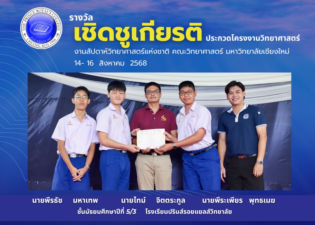 ขอชื่นชมและแสดงความยินดีทีมนักเรียน PRC ที่ได้รับรางวัลเชิดชูเกียรติ สาขากายภาพ จากการประกวดโครงงานวิทยาศาสตร์ ระดับมัธยมศึกษาตอนปลาย จากงานสัปดาห์วิทยาศาสตร์แห่งชาติ ส่วนภูมิภาค ประจําปี พ.ศ.2568 จัดโดย คณะวิทยาศาสตร์ มหาวิทยาลัยเชียงใหม่ ณ คณะวิทยาศาสตร์ มหาวิทยาลัยเชียงใหม่ ระหว่างวันที่ 14 – 16 สิงหาคม 2568