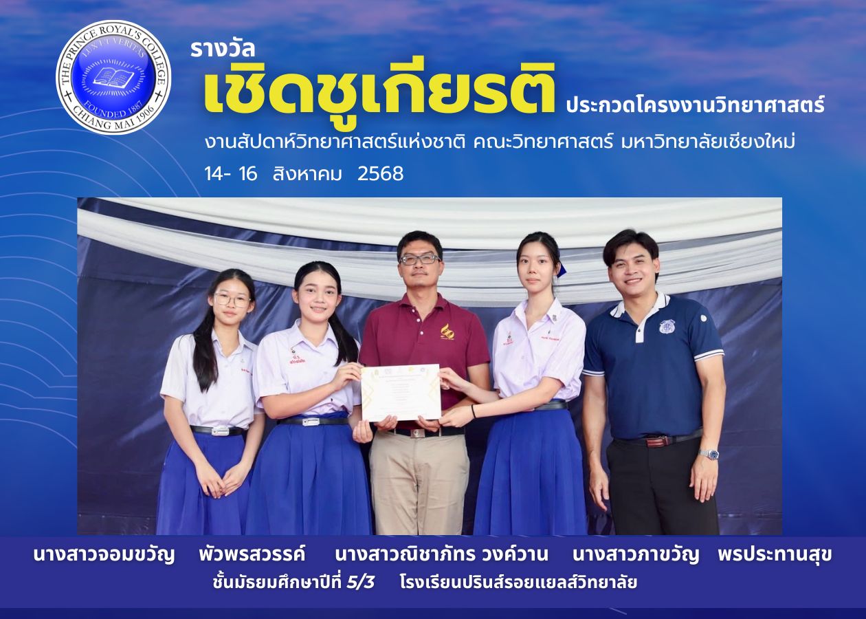 ขอชื่นชมและแสดงความยินดีทีมนักเรียน PRC ที่ได้รับรางวัลเชิดชูเกียรติ สาขากายภาพ  จากการประกวดโครงงานวิทยาศาสตร์ ระดับมัธยมศึกษาตอนปลาย  จากงานสัปดาห์วิทยาศาสตร์แห่งชาติ ส่วนภูมิภาค ประจําปี พ.ศ.2568 จัดโดย คณะวิทยาศาสตร์ มหาวิทยาลัยเชียงใหม่ ณ คณะวิทยาศาสตร์ มหาวิทยาลัยเชียงใหม่ ระหว่างวันที่ 14 – 16 สิงหาคม 2568