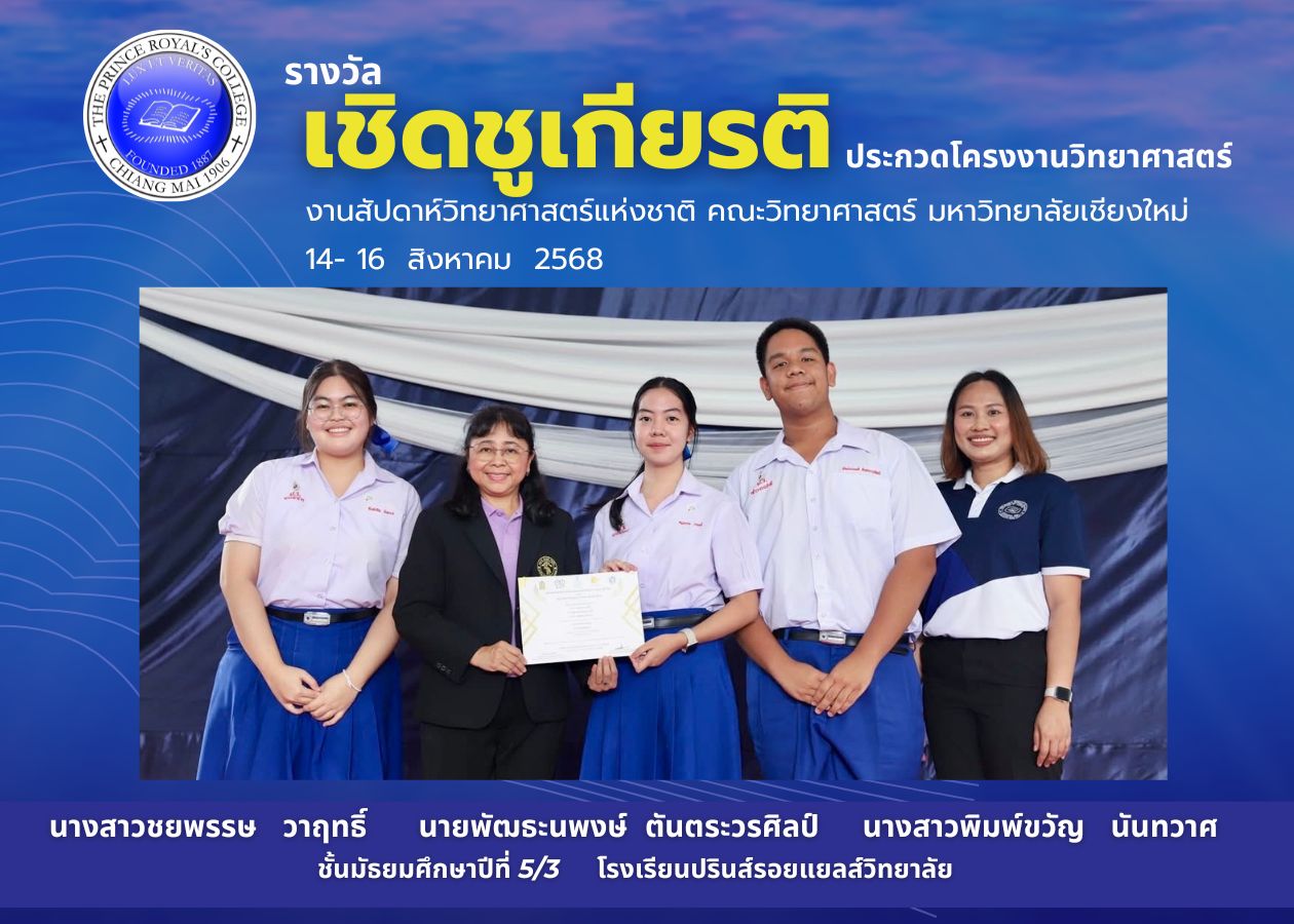 ขอชื่นชมและแสดงความยินดีทีมนักเรียน PRC ที่ได้รับรางวัลเชิดชูเกียรติ สาขาชีวภาพ  จากการประกวดโครงงานวิทยาศาสตร์ ระดับมัธยมศึกษาตอนปลาย  จากงานสัปดาห์วิทยาศาสตร์แห่งชาติ ส่วนภูมิภาค ประจําปี พ.ศ.2568 จัดโดย คณะวิทยาศาสตร์ มหาวิทยาลัยเชียงใหม่ ณ คณะวิทยาศาสตร์ มหาวิทยาลัยเชียงใหม่ ระหว่างวันที่ 14 – 16 สิงหาคม 2568