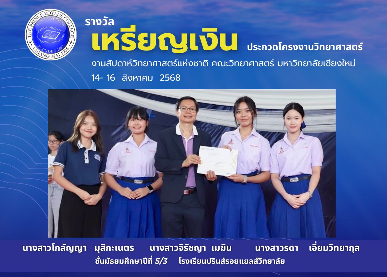 ขอชื่นชมและแสดงความยินดีทีมนักเรียน PRC ที่ได้รับรางวัลเชิดชูเกียรติ สาขาวิทยาศาสตร์ประยุกต์ จากการประกวดโครงงานวิทยาศาสตร์ ระดับมัธยมศึกษาตอนปลาย จากงานสัปดาห์วิทยาศาสตร์แห่งชาติ ส่วนภูมิภาค ประจําปี พ.ศ.2568 จัดโดย คณะวิทยาศาสตร์ มหาวิทยาลัยเชียงใหม่ ณ คณะวิทยาศาสตร์ มหาวิทยาลัยเชียงใหม่ ระหว่างวันที่ 14 – 16 สิงหาคม 2568