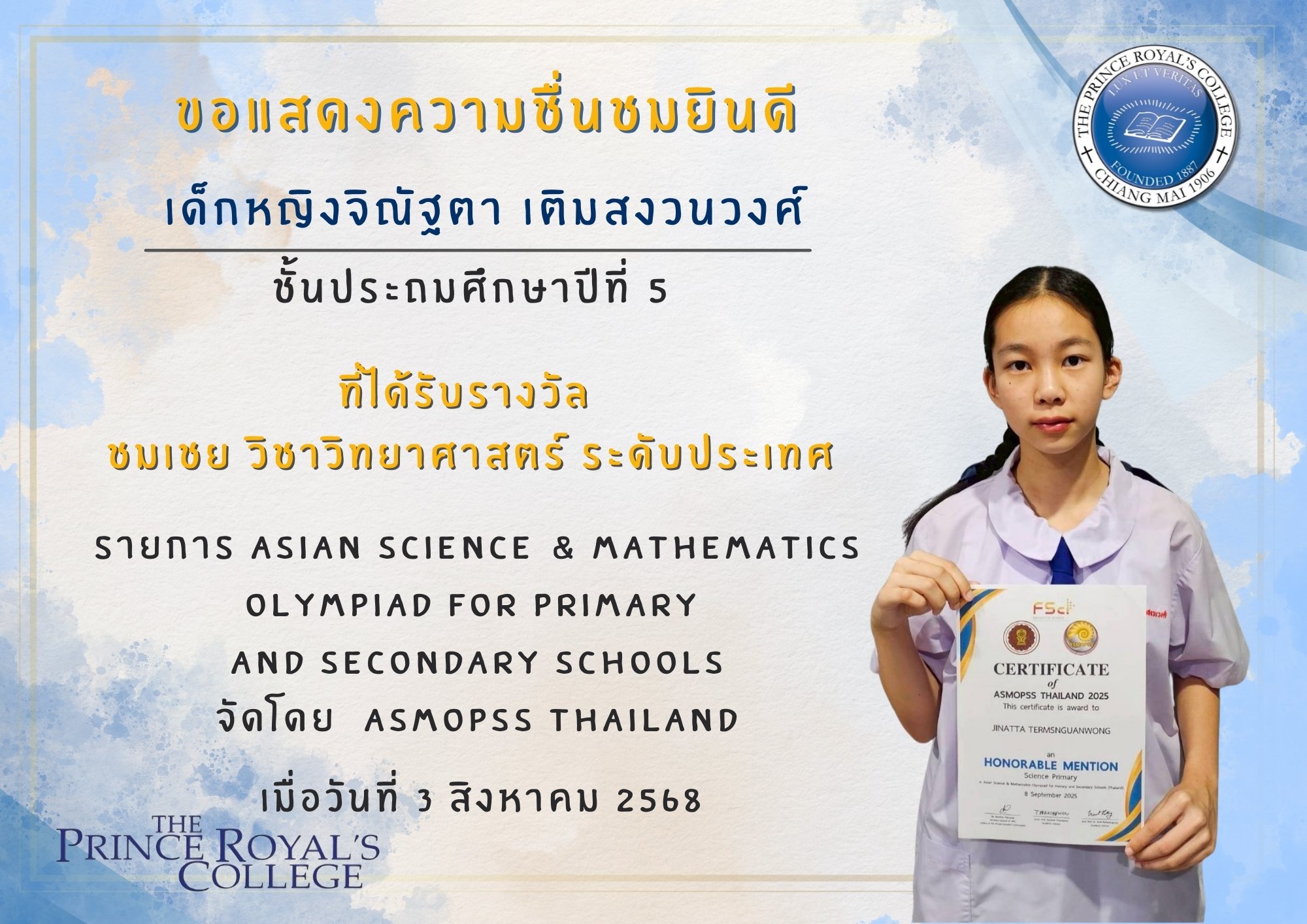 เด็กหญิงจิณัฐตา เติมสงวนวงศ์ ระดับชั้นประถมศึกษาปีที่ 5 ได้รับรางวัล ชมเชย วิชาวิทยาศาสตร์ ระดับประเทศ