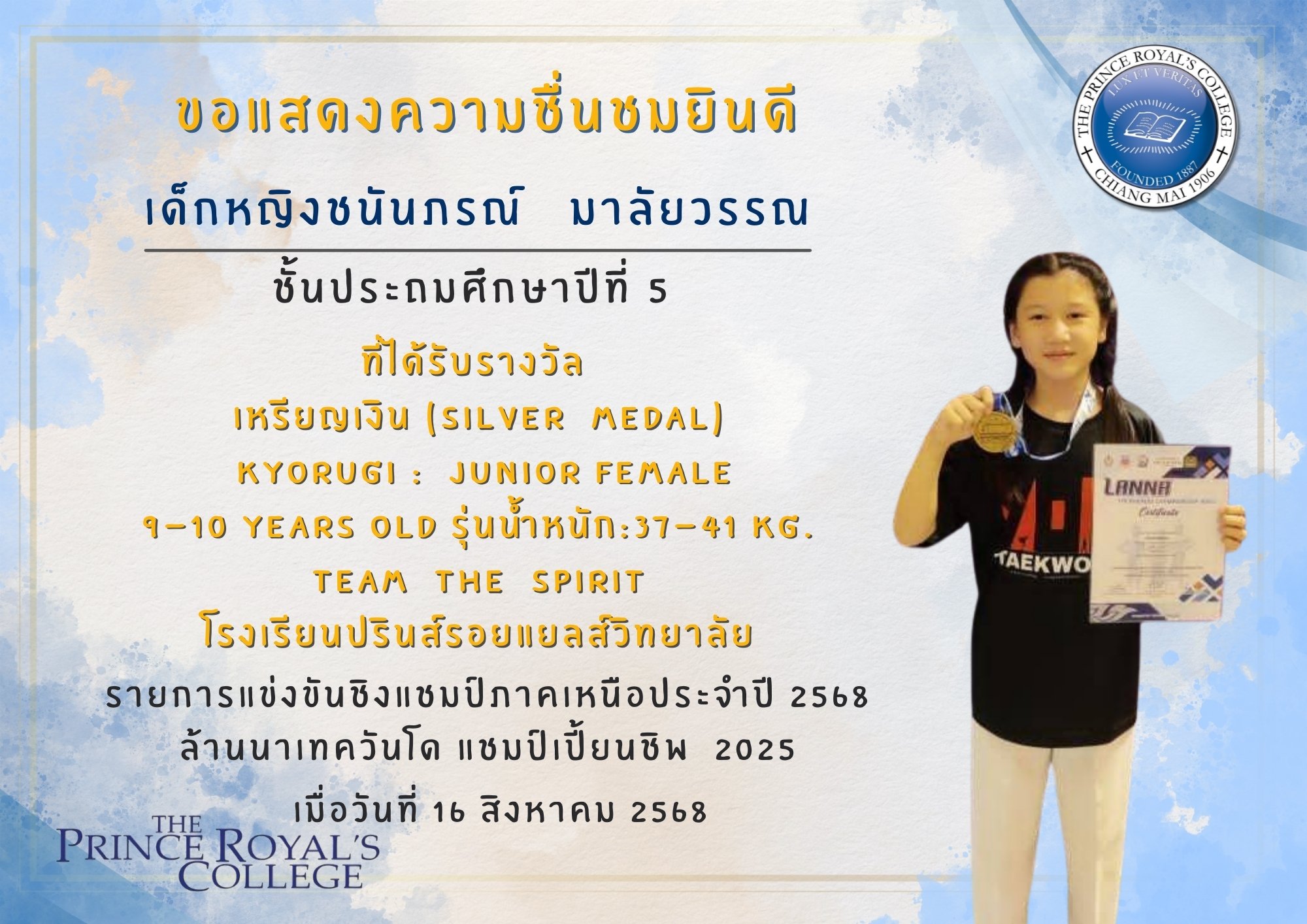 เด็กหญิงชนันภรณ์​   มาลัยวรรณ ระดับชั้นประถมศึกษาปีที่ 5 ได้รับรางวัลเหรียญเงิน  (SILVER​  MEDAL)
