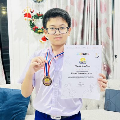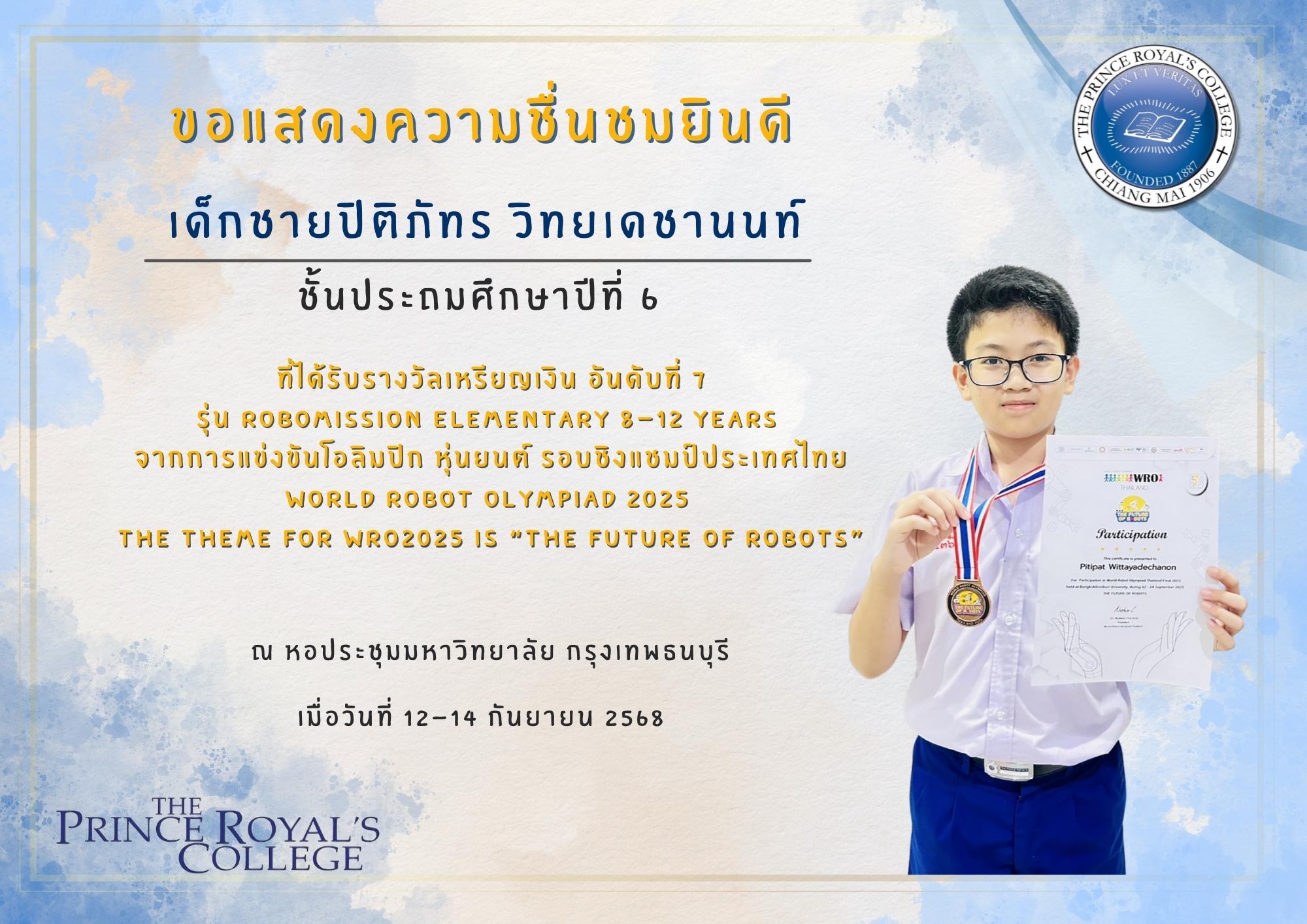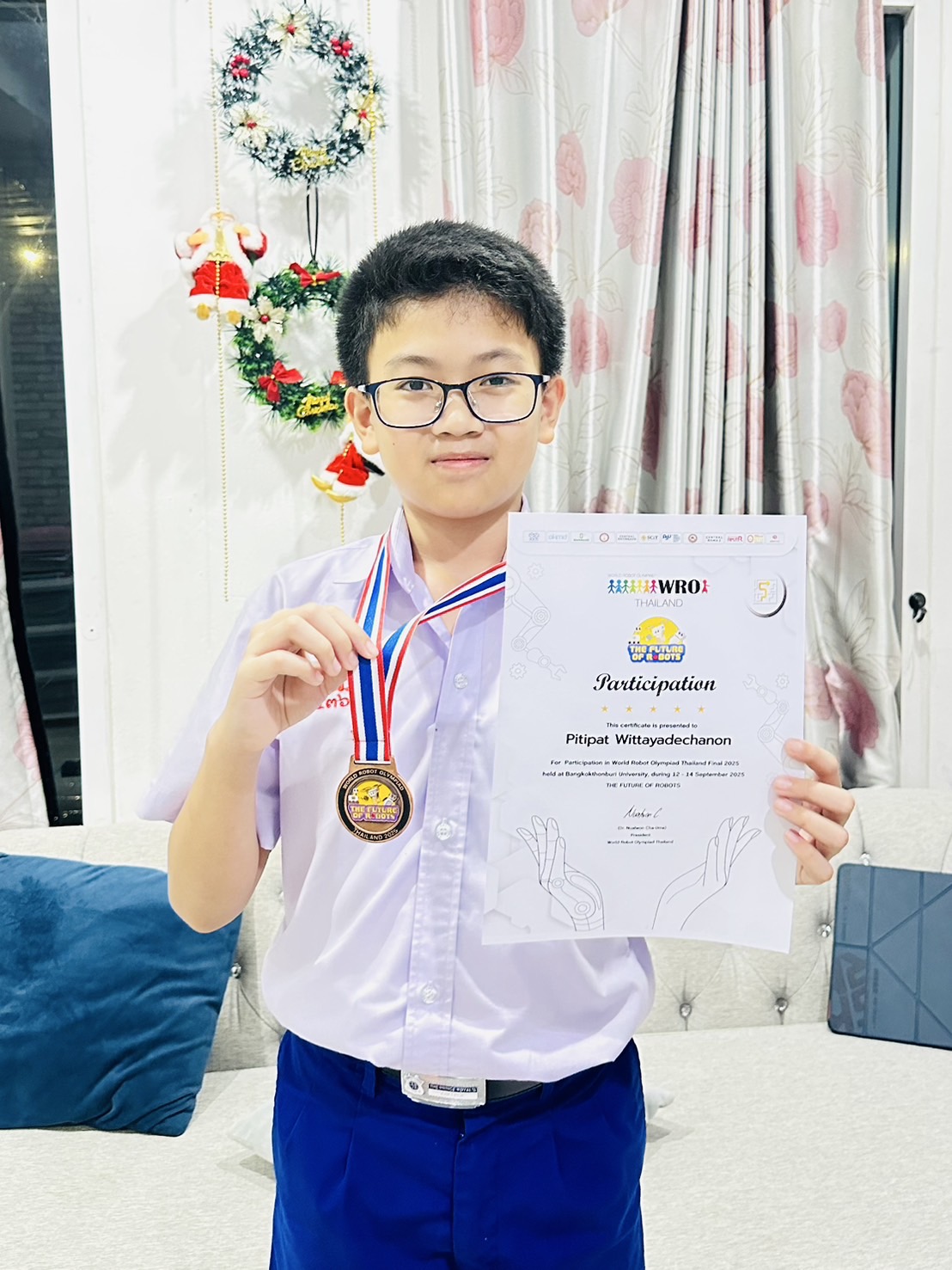 เด็กชายปิติภัทร วิทยเดชานนท์ รางวัลเหรียญเงิน อันดับที่ 7 รุ่น ROBOMISSION ELEMENTARY 8-12 YEARS จากการแข่งขันโอลิมปิก หุ่นยนต์ รอบชิงแชมป์ประเทศไทย World Robot Olympiad 2025 The Theme For WRO2025 is “The Future of Robots”