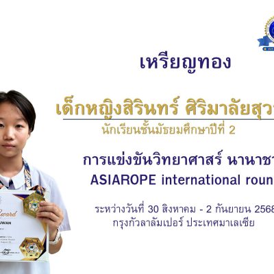 ขอชื่นชมและแสดงความยินดีกับ เด็กหญิงสิรินทร์ ศิริมาลัยสุวรรณ ชั้นมัธยมศึกษาปีที่ 2/4 ได้รับเหรียญทอง category 5 การแข่งขันวิทยาศาสร์นานาชาติ ASIAROPE international round ระหว่างวันที่ 30 สิงหาคม – 2 กันยายน 2568 จัดที่กรุงกัวลาลัมเปอร์ ประเทศมาเลเซีย