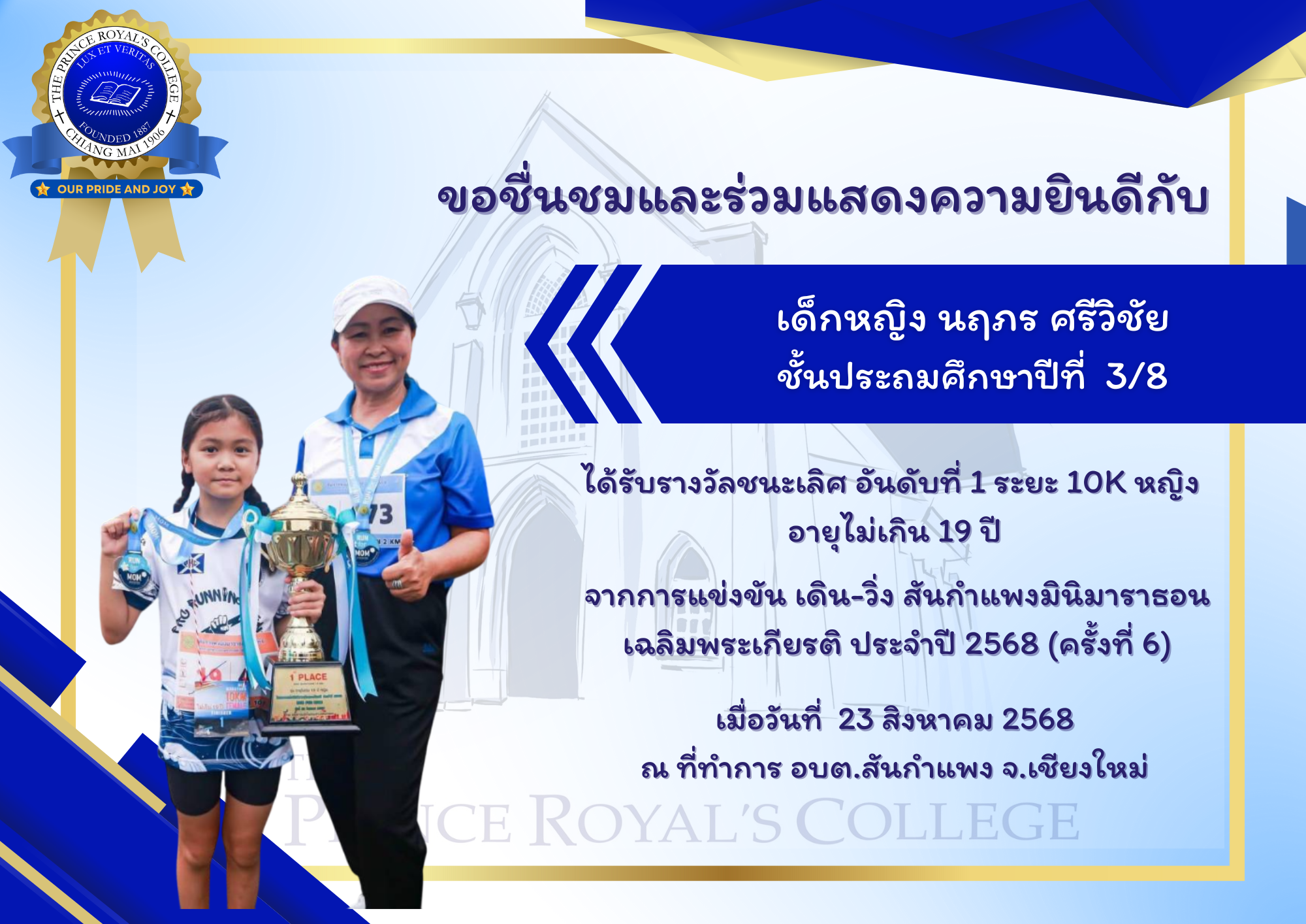 ได้รับรางวัลชนะเลิศ อันดับที่ 1 ระยะ 10K หญิง อายุไม่เกิน 19 ปี