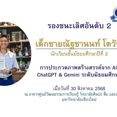 ขอชื่นชมและร่วมแสดงความยินดีกับ เด็กชายณัฐชานนท์ โตวัน ชั้นมัธยมศึกษาปีที่ 2/2 ได้รับ รางวัลรองชนะเลิศอันดับ 2 การประกวดภาพสร้างสรรค์จาก AI : ChatGPT & Gemini ระดับมัธยมศึกษา โดย ศูนย์การพัฒนาองค์ความรู้และการจัดการนวัตกรรม (Knownledge and Innovation Development:KIND) วิทยาลัยศิลปะ สื่อและเทคโนโลยี มหาวิทยาลัยเชียงใหม่ ณ อาคารศูนย์วัฒนธรรมการเรียนรู้ วิทยาลัยศิลปะ สื่อ และเทคโนโลยี มหาวิทยาลัยเชียงใหม่ เมื่อวันที่ 30 สิงหาคม 2568