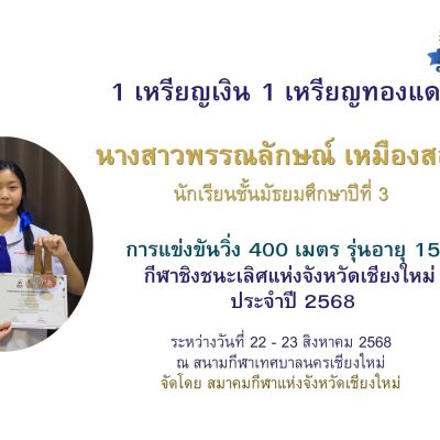 และ รางวัลรองชนะเลิศอันดับที่ 2 เหรียญทองแดง การแข่งขันวิ่งผลัด 4*400 เมตร หญิง รุ่นอายุ 15 ปี ในการแข่งขันกีฬาชิงชนะเลิศแห่งจังหวัดเชียงใหม่ ประจำปีงบประมาณ พ.ศ.2568 เมื่อวันที่ 22-23 สิงหาคม 2568 จัดโดย การกีฬาแห่งประเทศไทย และสมาคมกีฬาแห่งจังหวัดเชียงใหม่