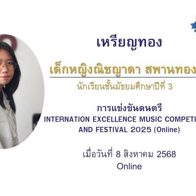 ขอชื่นชมและร่วมแสดงความยินดีกับ เด็กหญิงณิชญาดา สพานทอง ชั้นมัธยมศึกษาปีที่ 3/4 ได้รับ ถ้วยรางวัลและประกาศนียบัตรเหรียญทอง (GOLD PRIZE) ในการแข่งขันดนตรีรายการ INTERNATION EXCELLENCE MUSIC COMPETITION AND FESTIVAL 2025 (Online) เมื่อวันที่ 31 กรกฎาคม 2568 และประกาศผลวันที่ 30 สิงหาคม 2568 จัดโดยบริษัท กู๊ด กรูฟซ์ เอนเตอร์เทนเมนท์ จำกัด