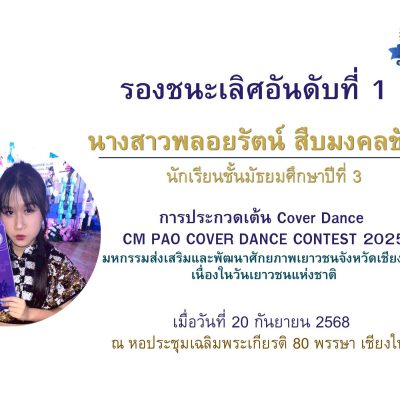 ขอชื่นชมและร่วมแสดงความยินดีกับนางสาวพลอยรัตน์ สืบมงคลชัย ชั้นมัธยมศึกษาปีที่ 3/8 ได้รับรางวัลรองชนะเลิศอันดับที่ 1 ในการประกวดเต้น Cover Dance CM PAO COVER DANCE CONTEST 2025 มหกรรมส่งเสริมและพัฒนาศักยภาพเยาวชนจังหวัดเชียงใหม่เนื่องในวันเยาวชนแห่งชาติประจำปี 2568 เมื่อวันที่ 20 กันยายน 2568 ณ หอประชุมเฉลิมพระเกียรติ 80 พรรษา เชียงใหม่ จัดโดยองค์การบริหารส่วนจังหวัดเชียงใหม่