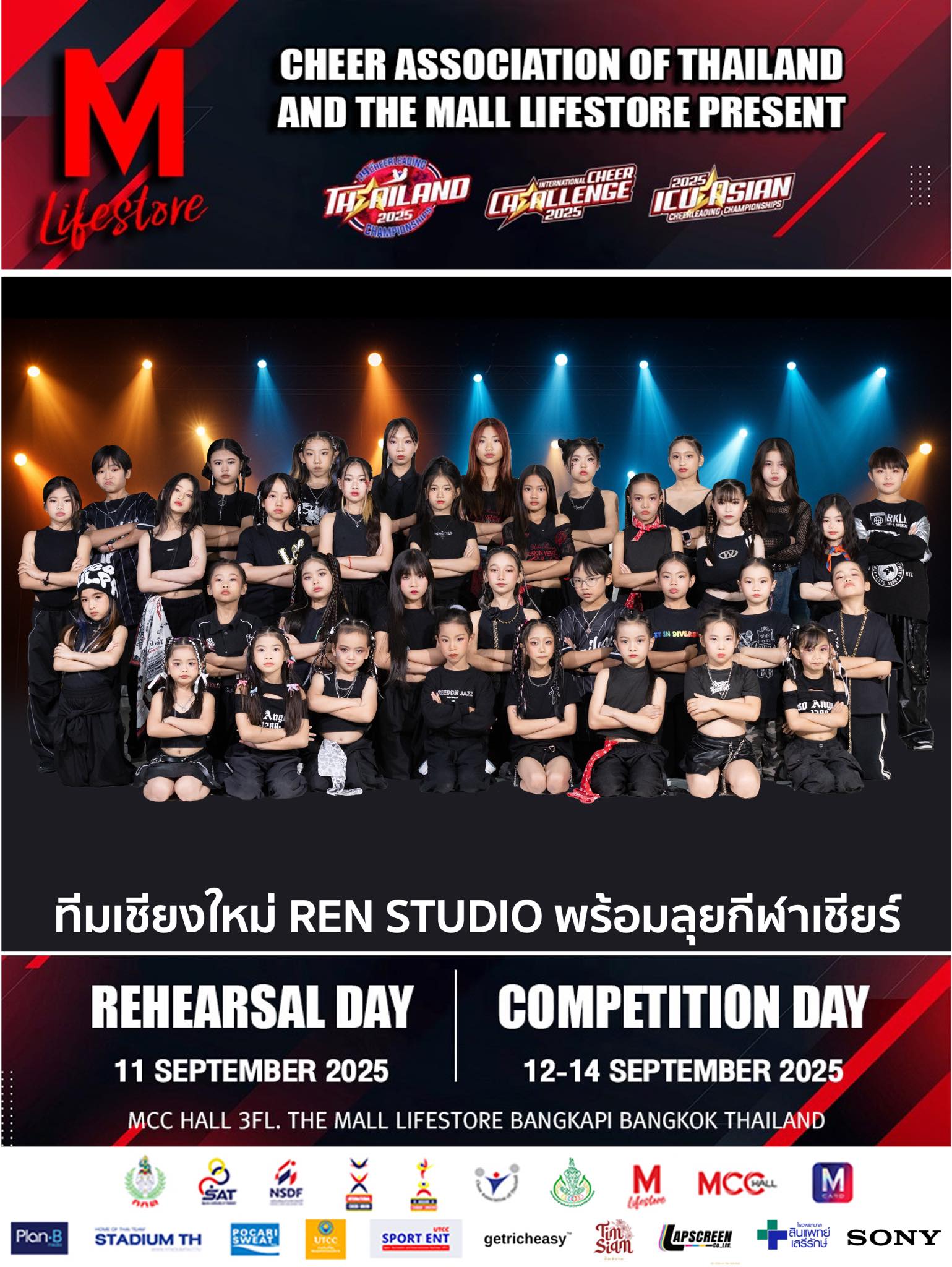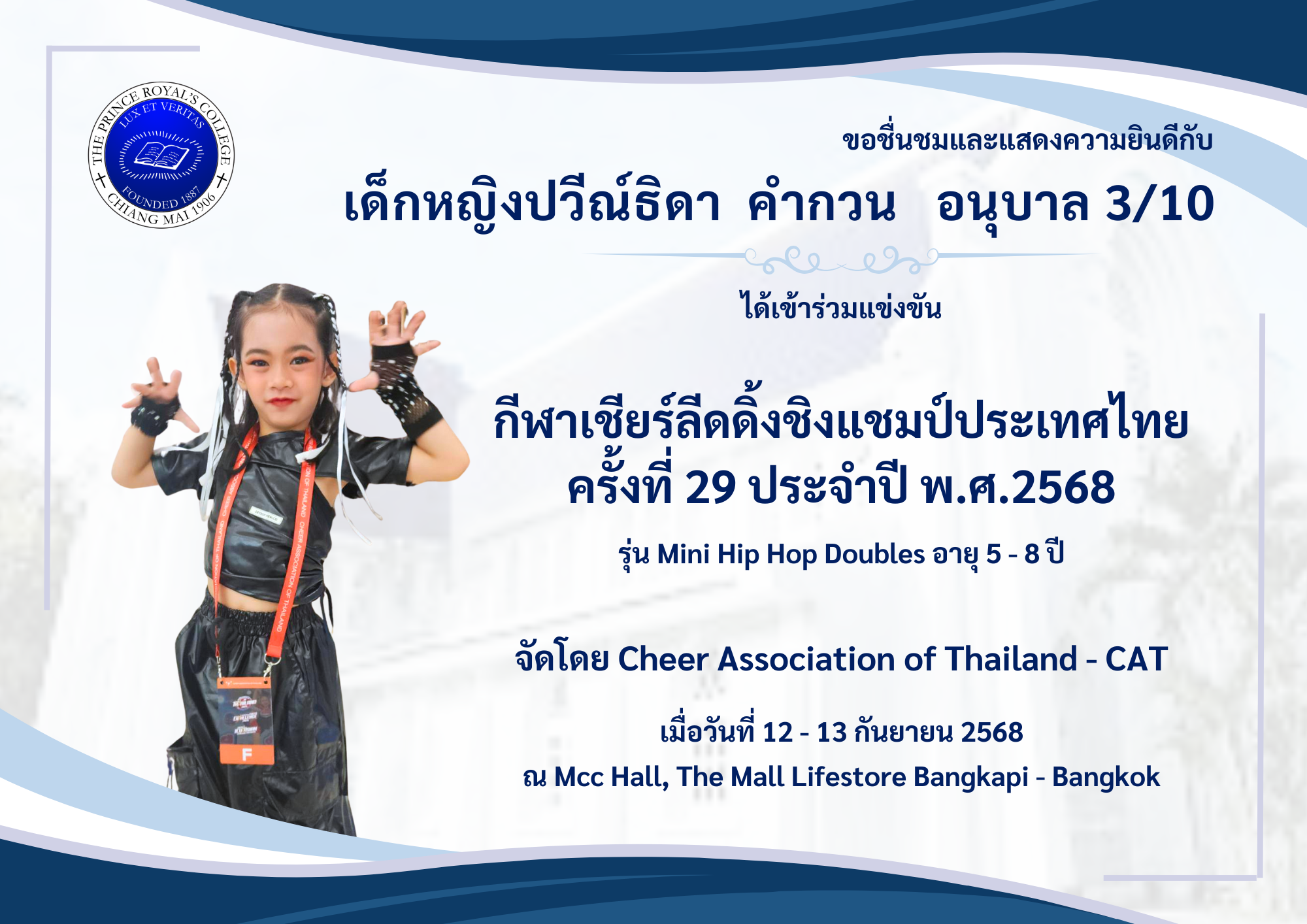 - กีฬาเชียร์ลีดดิ้งชิงแชมป์ประเทศไทย ครั้งที่ 29 ประจำปี พ.ศ.2568 รุ่น Mini Hip Hop Doubles อายุ 5 – 8 ปี