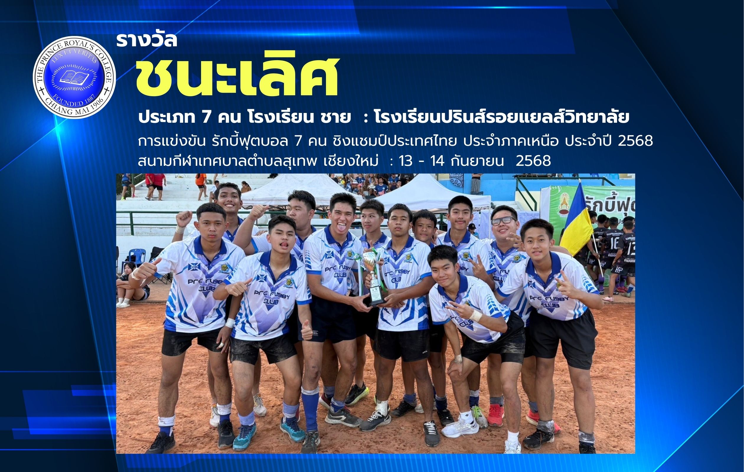 ขอชื่นชมและแสดงความยินดีกับ นักกีฬารักบี้ฟุตบอล PRC ที่ได้รับรางวัลจากการแข่งขัน รักบี้ฟุตบอล 7 คน ชิงแชมป์ประเทศไทย ประจำภาคเหนือ ประจำปี 2568 จัดโดย สมาคมกีฬารักบี้ฟุตบอล แห่งประเทศไทยในพระบรมราชูปถัมภ์ ส่วนภูมิภาค ประจำภาคเหนือ ณ สนามกีฬาเทศบาลตำบลสุเทพ จังหวัดเชียงใหม่ เมื่อวันที่ 13 – 14 กันยายน 2568 (ระดับภาค)