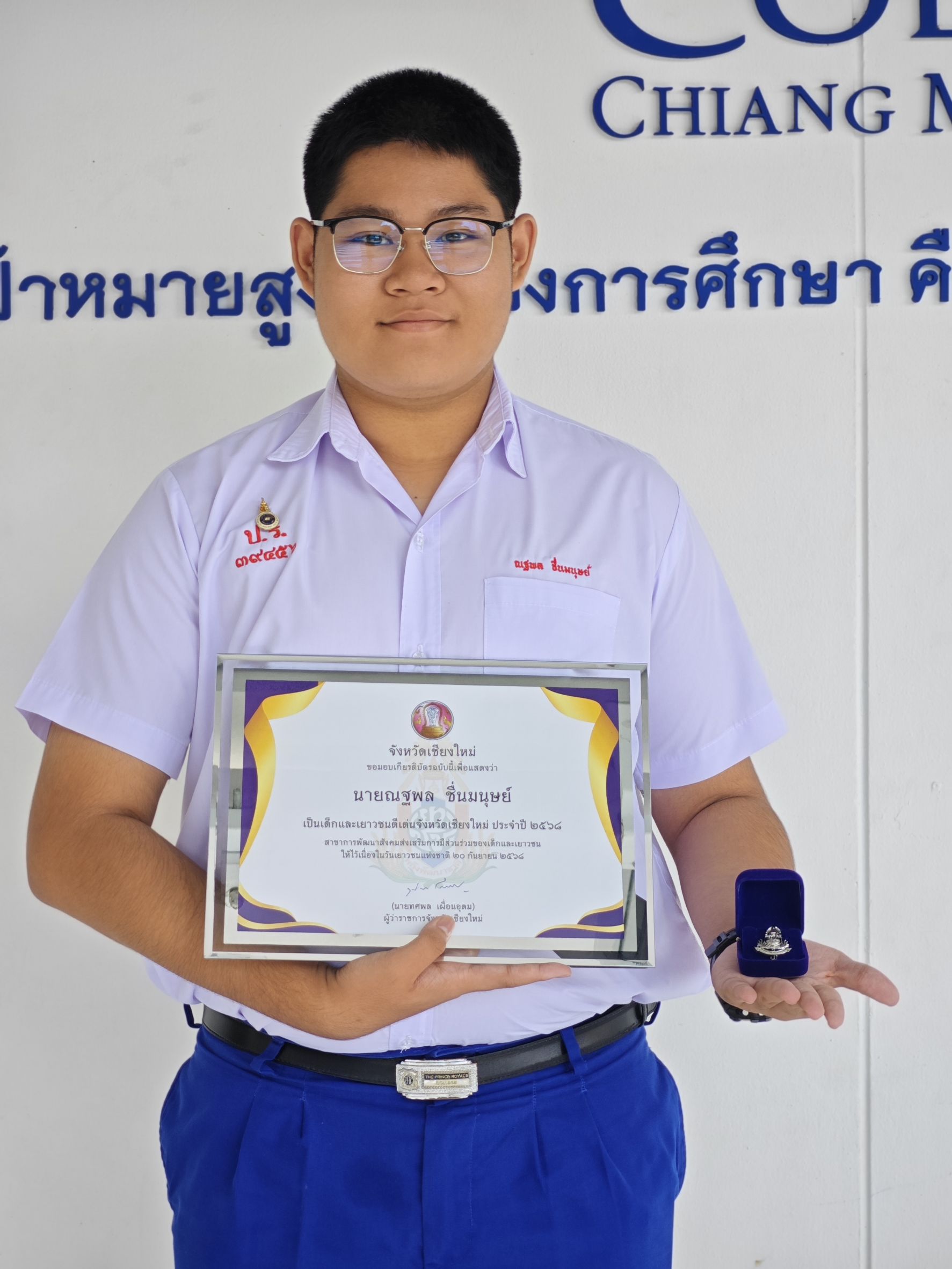 ขอชื่นชมและแสดงความยินดีกับ นายณฐพล ชื่นมนุษย์ ม.6/11 ที่ได้รับคัดเลือกให้เป็นเด็กและเยาวชนดีเด่นจังหวัดเชียงใหม่ ประจำปี 2568 สาขาการพัฒนาสังคม ส่งเสริมการมีส่วนร่วมของเด็กและเยาวชน รับเกียรติบัตรจากผู้ว่าราชการจังหวัดเชียงใหม่ ในวันเยาวชนแห่งชาติจังหวัดเชียงใหม่ จัดโดย จังหวัดเชียงใหม่ร่วมกับ สภาเด็กและเยาวชนจังหวัดเชียงใหม่ และบ้านพักเด็กและครอบครัวจังหวัดเชียงใหม่ ณ ห้องประชุมสถานีตำรวจภูธรจังหวัดเชียงใหม่ เมื่อวันที่ 14 กันยายน 2568 (ระดับจังหวัด)