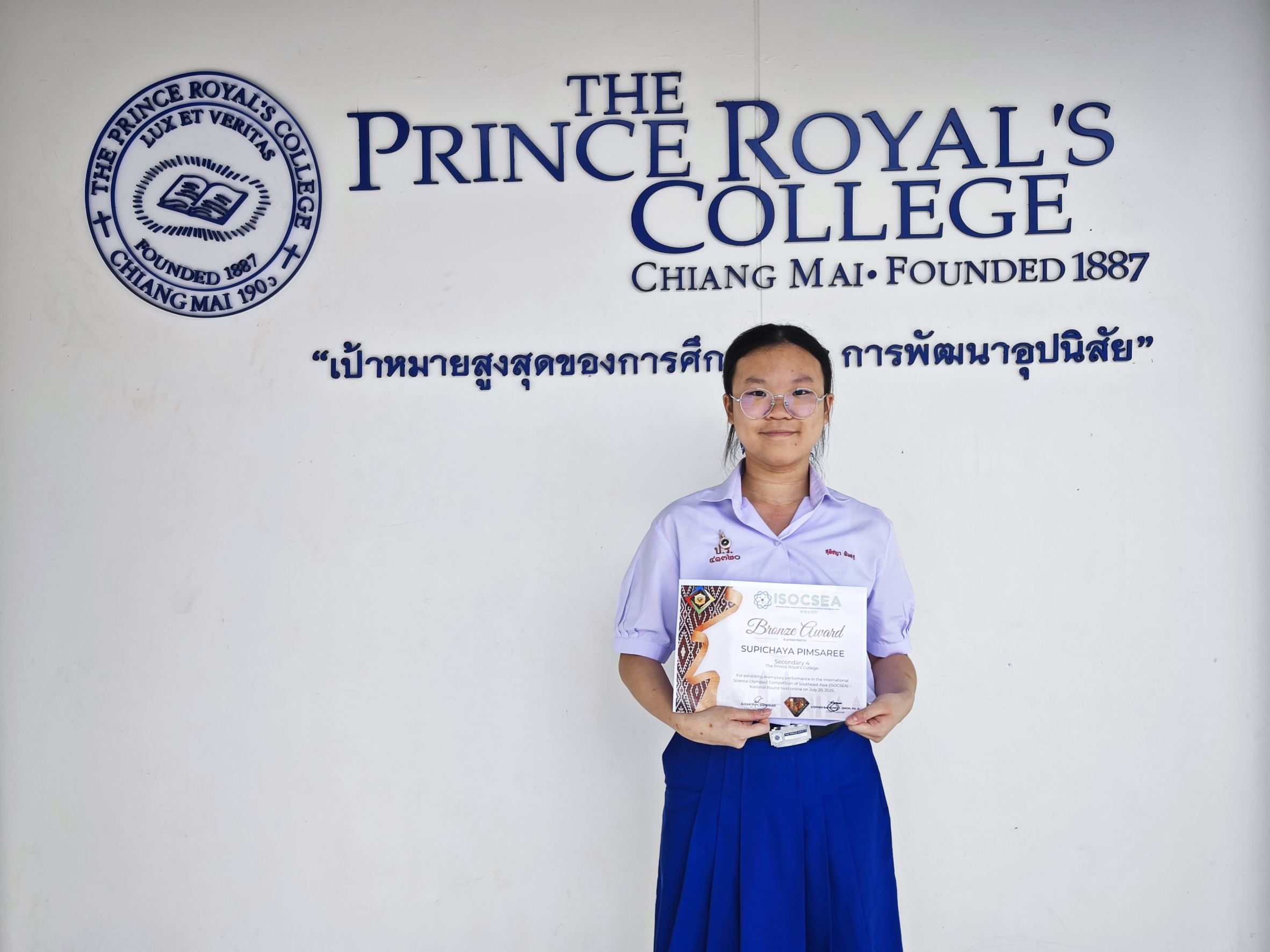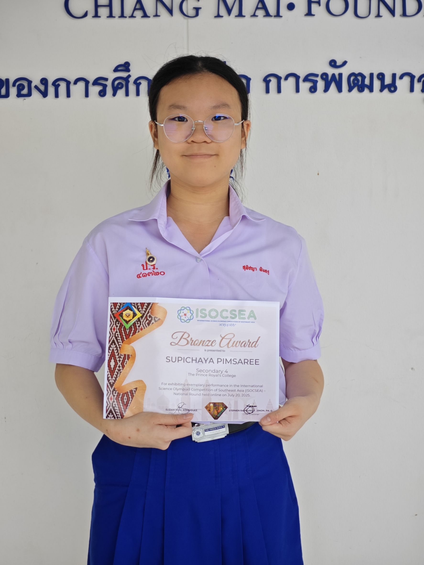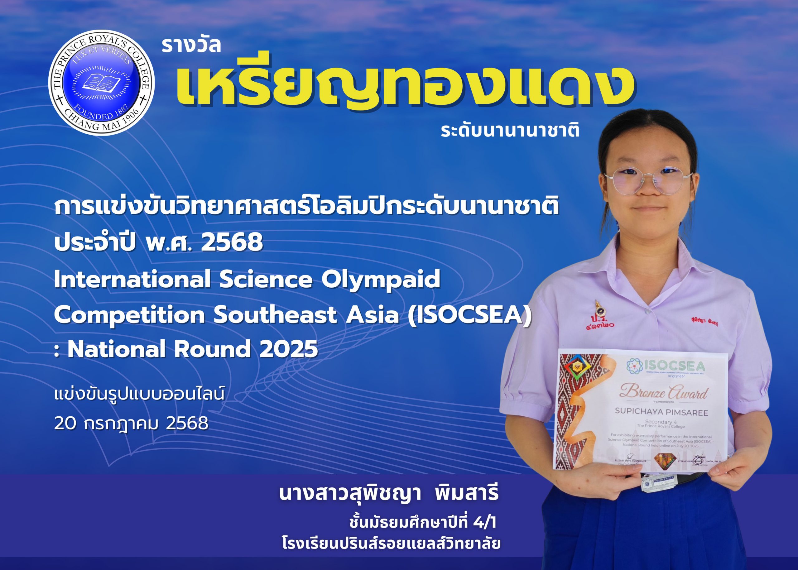 ขอชื่นชมและแสดงความยินดีกับ นางสาวสุพิชญา พิมสารี ม.4/1 ที่ได้รับรางวัลเหรียญทองแดง Bronze Award ระดับ Secondary 4 (Grade 10) จากการแข่งขันวิทยาศาสตร์โอลิมปิกระดับนานาชาติ ประจําปี พ.ศ. 2568 International Science Olympaid Competition Southeast Asia (ISOCSEA) : National Round 2025 จัดโดย META Knowledge แข่งขันรูปแบบออนไลน์ เมื่อวันที่ 20 กรกฎาคม 2568 รับเกียรติบัตร 12 กันยายน 2568 (ระดับนานาชาติ)