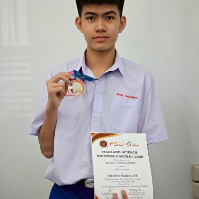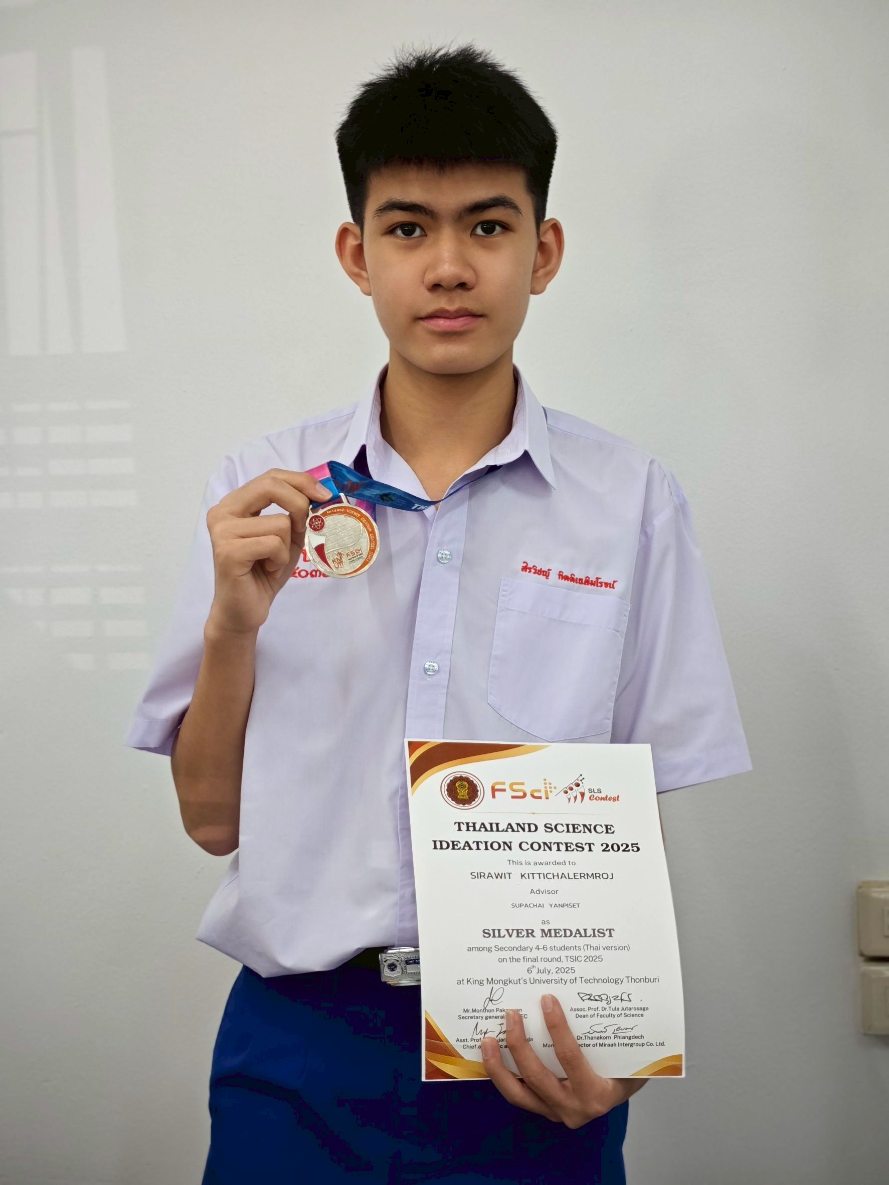 ขอชื่นชมและแสดงความยินดีกับ นายสิรวิชญ์ กิตติเฉลิมโรจน์ ม.5/1 ได้รับรางวัลเหรียญเงิน ระดับ Silver Medalist (Thai version) จากโครงการแข่งขันการพูดประกวดความคิดสร้างสรรค์โครงงานหรือสิ่งประดิษฐ์ทางวิทยาศาสตร์ Thailand Science Ideation Contest on the final round 2025 จัดโดย คณะวิทยาศาสตร์ มหาวิทยาลัยเทคโนโลยีพระจอมเกล้าธนบุรี (KMUTT) ณ คณะวิทยาศาสตร์ มหาวิทยาลัยเทคโนโลยีพระจอมเกล้าธนบุรี เมื่อวันที่ 5 – 6 กรกฎาคม 2568 (ระดับประเทศ)