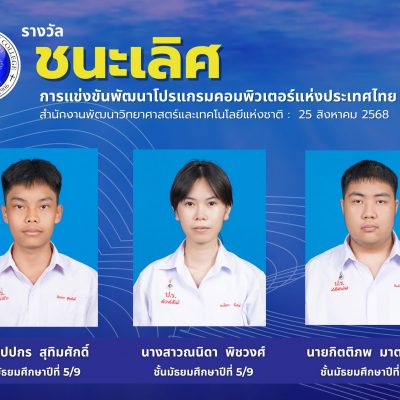 ขอชื่นชมและแสดงวามยินดีกับ ทีมนักเรียน PRC ที่ได้รับรางวัลชนะเลิศ โปรแกรมเพื่อความบันเทิง ระดับนักเรียน จากการแข่งขันพัฒนาโปรแกรมคอมพิวเตอร์แห่งประเทศไทย ครั้งที่ 27 (NSC) จัดโดย สำนักงานพัฒนาวิทยาศาสตร์ และเทคโนโลยีแห่งชาติ (สวทช.) รูปแบบออนไลน์ เมื่อวันที่ 25 สิงหาคม 2568 (ระดับประเทศ)