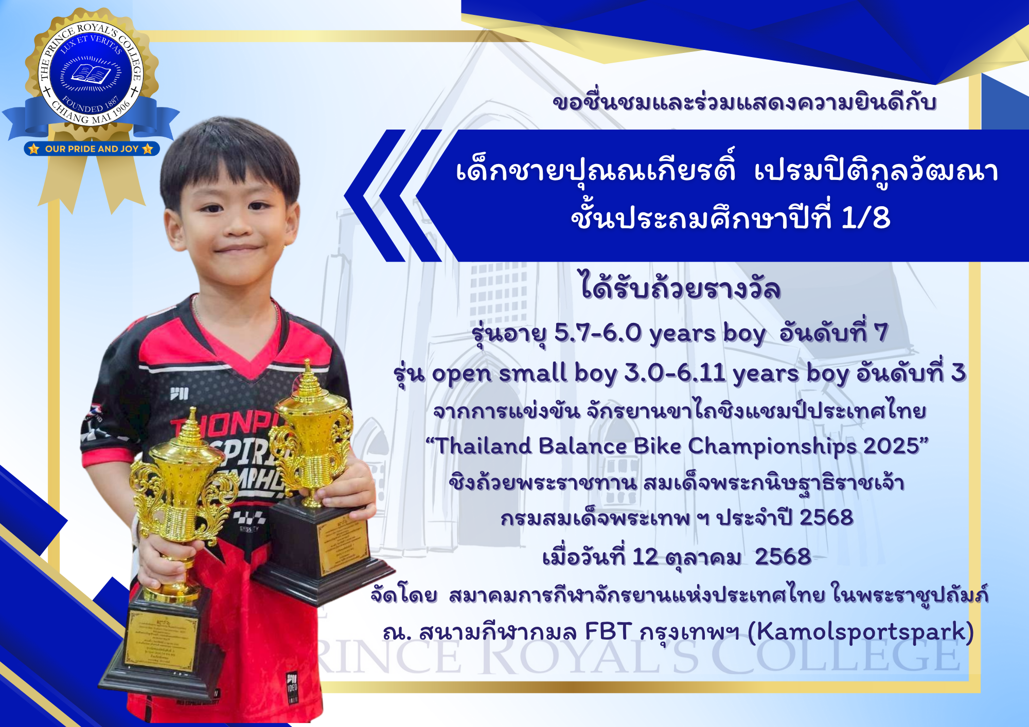 ขอชื่นชมและร่วมแสดงความยินดีกับ เด็กชายปุณณเกียรติ์ เปรมปิติกูลวัฒณา ชั้นประถมศึกษาปีที่ 1/8 ได้รับถ้วยรางวัล รุ่นอายุ 5.7-6.0 years boy อันดับที่ 7 รุ่น open small boy 3.0-6.11 years boy อันดับที่ 3 จากการแข่งขัน จักรยานขาไถชิงแชมป์ประเทศไทย “Thailand Balance Bike Championships 2025” ชิงถ้วยพระราชทาน สมเด็จพระกนิษฐาธิราชเจ้า กรมสมเด็จพระเทพ ฯ ประจำปี 2568 เมื่อวันที่ 12 ตุลาคม 2568 จัดโดย สมาคมการกีฬาจักรยานแห่งประเทศไทย ในพระราชูปถัมภ์ ณ. สนามกีฬากมล FBT กรุงเทพฯ (Kamolsportspark)