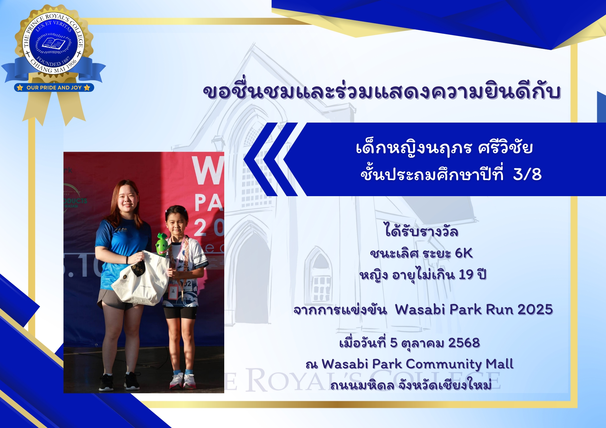 ขอชื่นชมและร่วมแสดงความยินดีกับเด็กหญิงนฤภร ศรีวิชัย นักเรียนชั้นประถมศึกษาปีที่ 3/8 ได้รับรางวัล ชนะเลิศ ระยะ 6K หญิง อายุไม่เกิน 19 ปี จากการแข่งขัน  Wasabi Park Run 2025