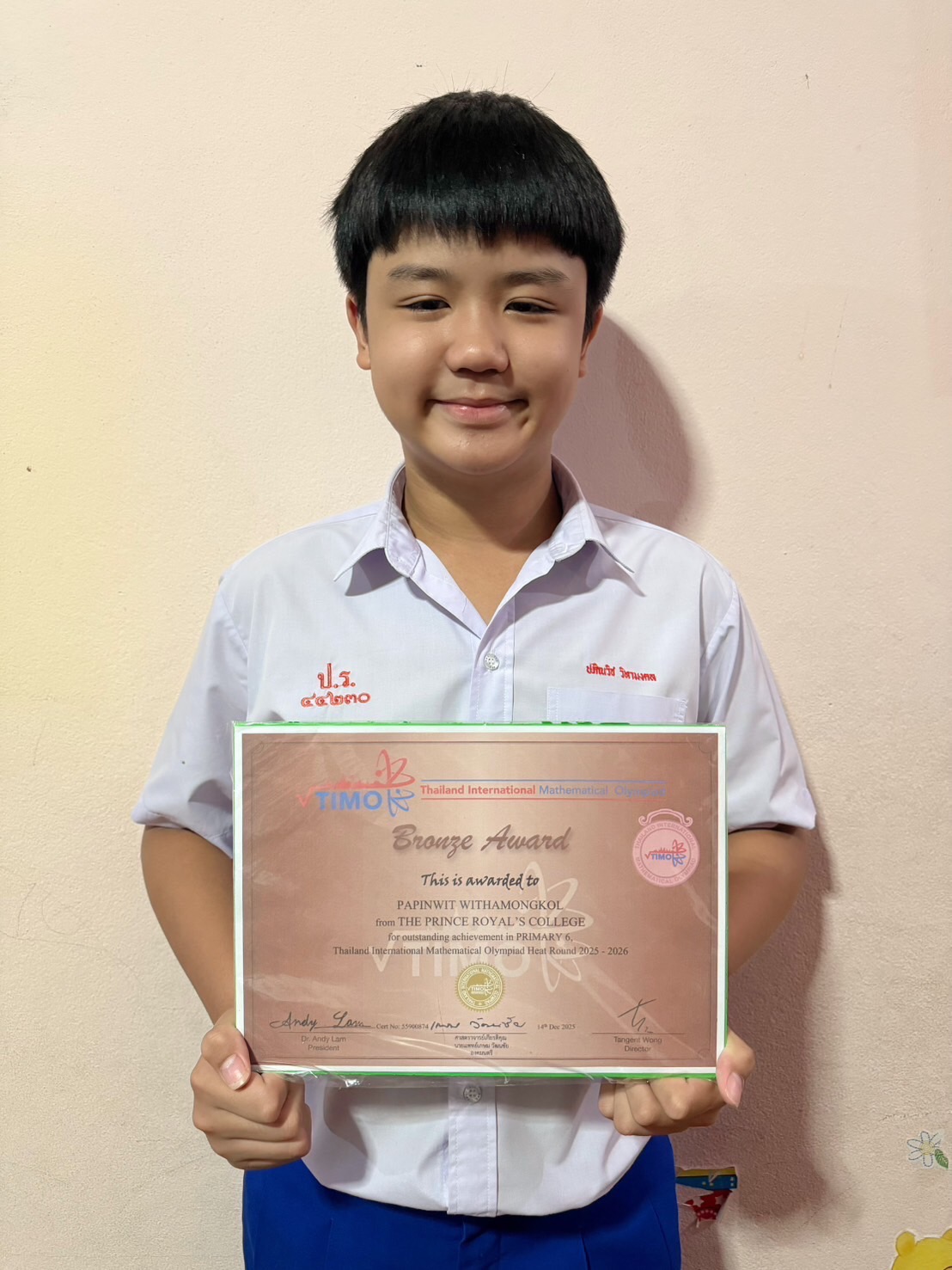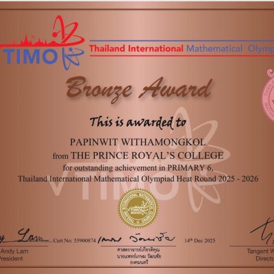 ที่ได้รับรางวัลเหรียญทองแดง ระดับ Bronze Award จากการแข่งขันรายการ Thailand International Mathematical Olympiad (TIMO) Heat Round 2026 Thailand