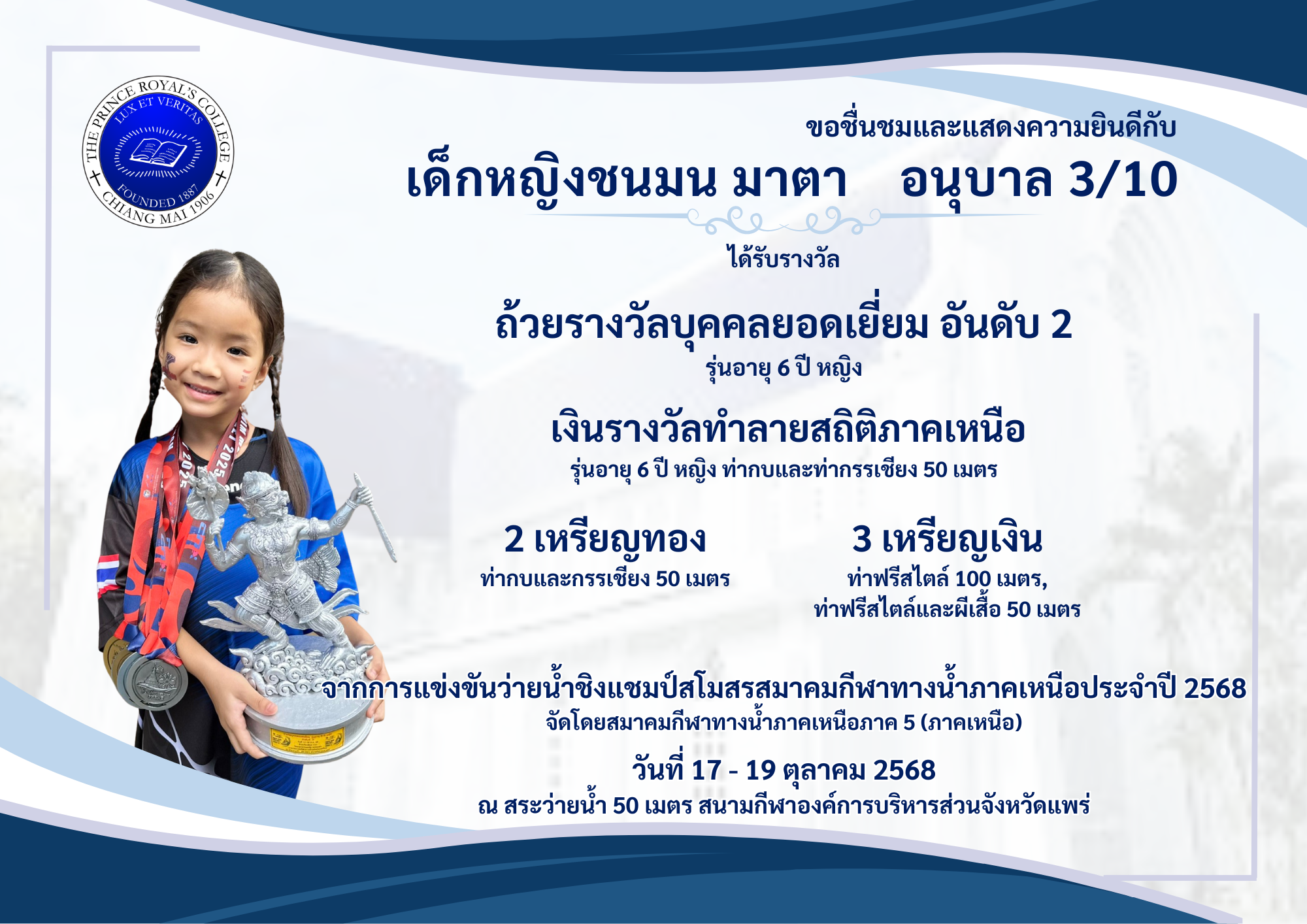 จากการแข่งขันว่ายน้ำชิงแชมป์สโมสรสมาคมกีฬาทางน้ำภาคเหนือประจำปี 2568 จัดโดยสมาคมกีฬาทางน้ำภาคเหนือภาค 5 (ภาคเหนือ)