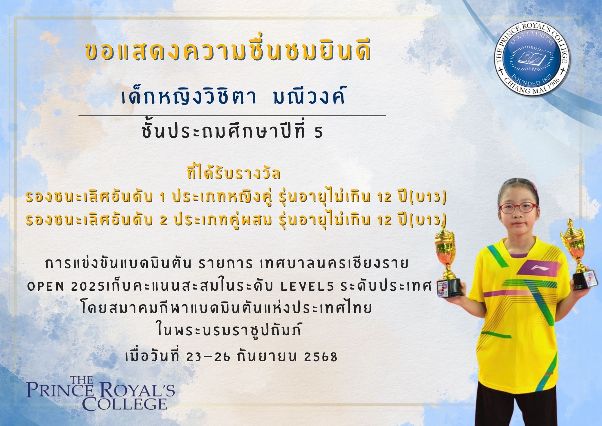 - รองชนะเลิศอันดับ 2 ประเภทคู่ผสม รุ่นอายุไม่เกิน 12 ปี (U13)