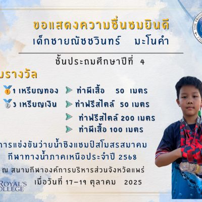 ได้รับรางวัล : เหรียญทอง ท่าผีเสื้อ 50 เมตร