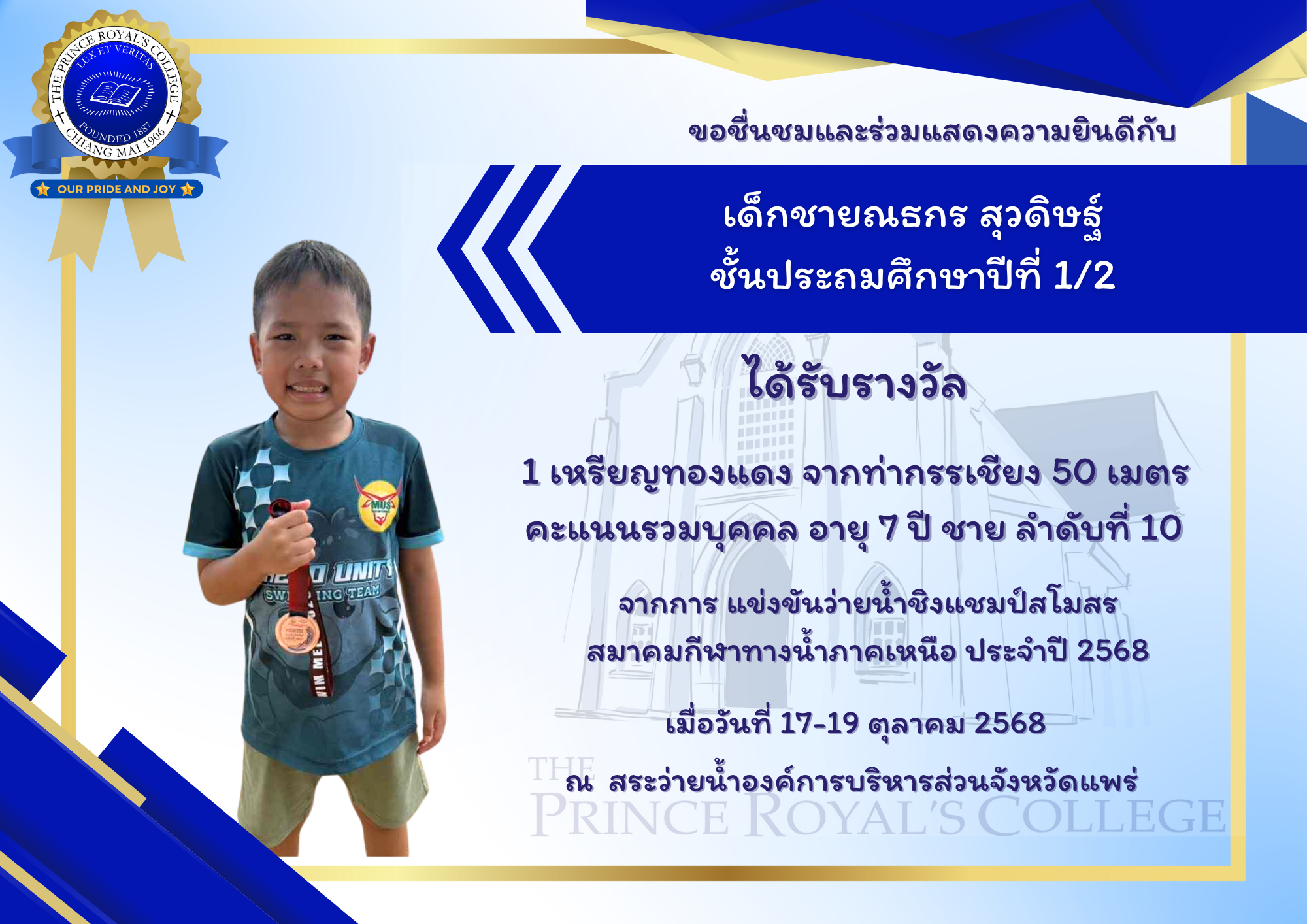 เด็กชายณธกร สุวดิษฐ์ ชั้นประถมศึกษาปีที่ 1/2 ได้รับรางวัล 1 เหรียญทองแดง จากท่ากรรเชียง 50 เมตร และ คะแนนรวมบุคคล อายุ 7 ปี ชาย ลำดับที่ 10