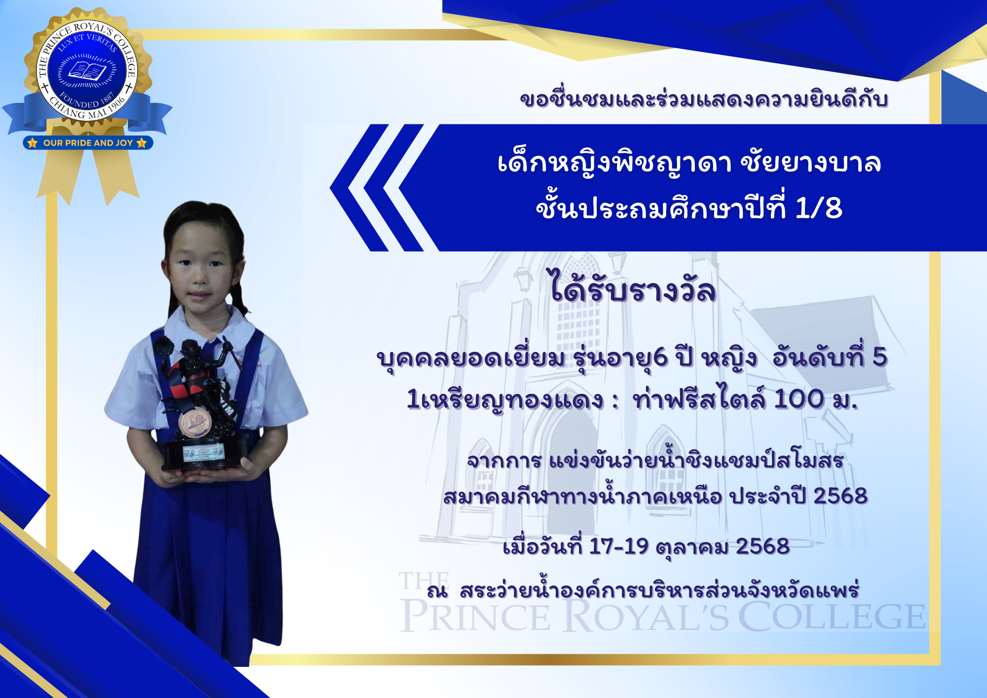 เด็กหญิงพิชญาดา ชัยยางบาล ชั้นประถมศึกษาปีที่ 1/8 ได้รับรางวัล บุคคลยอดเยี่ยม รุ่นอายุ6 ปี หญิง อันดับที่ 5 และ 1เหรียญทองแดง : ท่าฟรีสไตล์ 100 เมตร