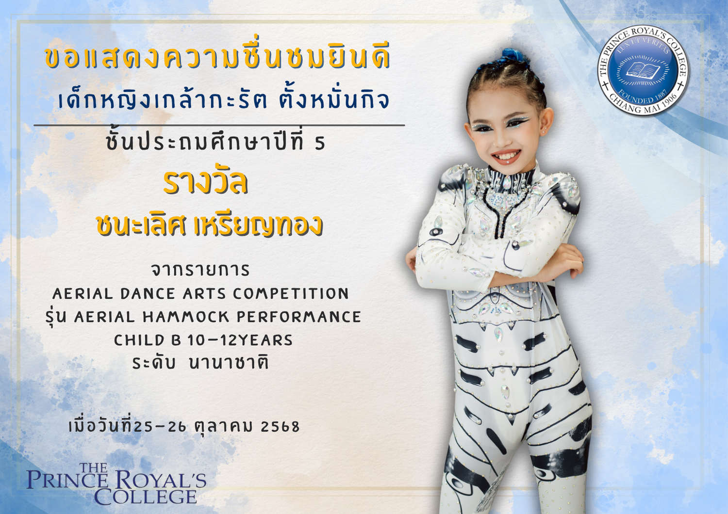 เด็กหญิงเกล้ากะรัต ตั้งหมั่นกิจ รางวัล ชนะเลิศ เหรียญทอง จากรายการ Aerial Dance Arts Competition รุ่น Aerial Hammock Performance Child B 10-12Years ระดับ  นานาชาติ